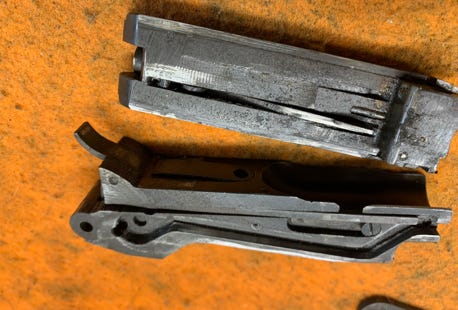 I made a replacement pin from spring stock, cut a vertical groove through the threads of the extractor shaft, and soldered them both in place with hi-strength solder.Then I made a replacement extractor operator (pictured on the left)from mild steel which I case hardened for strength, wear, and durability.As if this wasn’t enough, the retaining screw for the extractor broke into three pieces when I removed it so I redialed and tapped it and replaced it with a custom sized set screw.Simple problem - you’d think.Spent over two hours on restoring the great old shotgun to service.