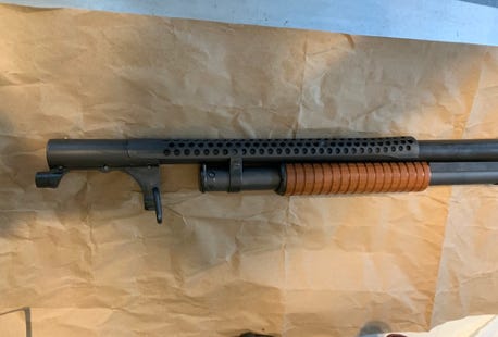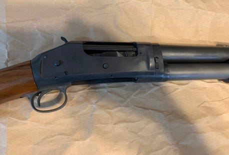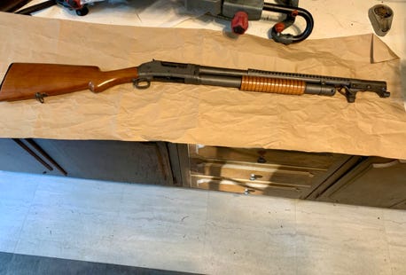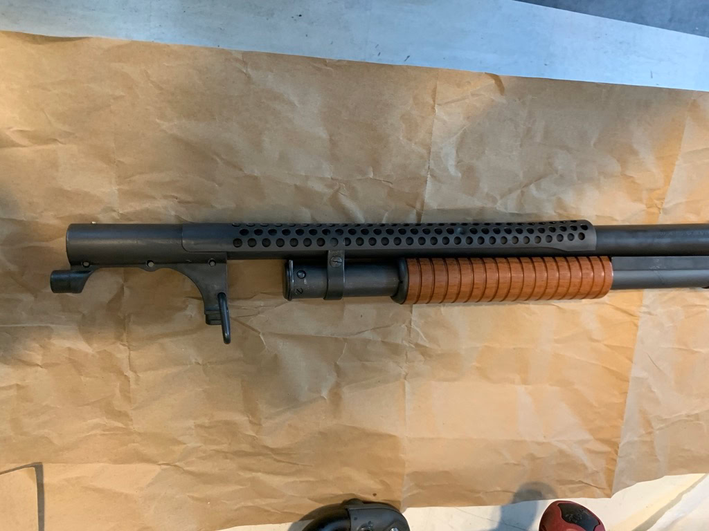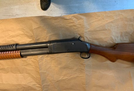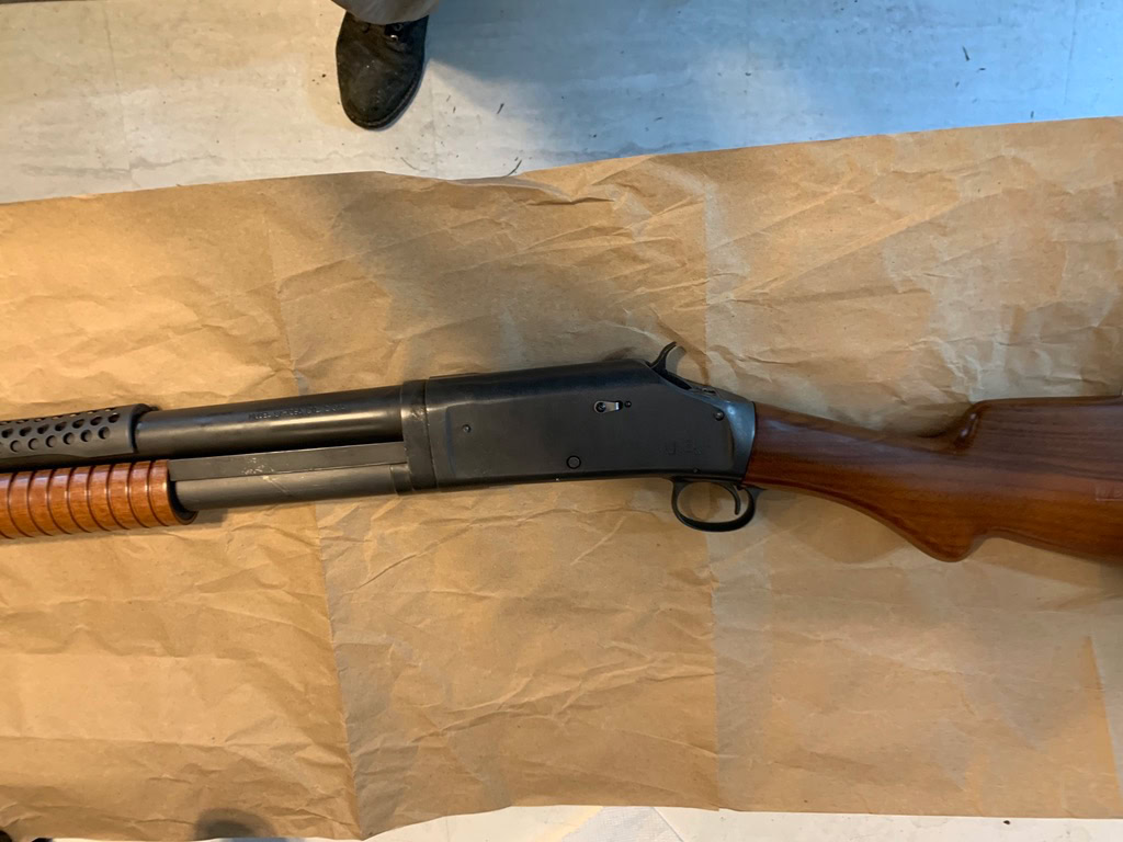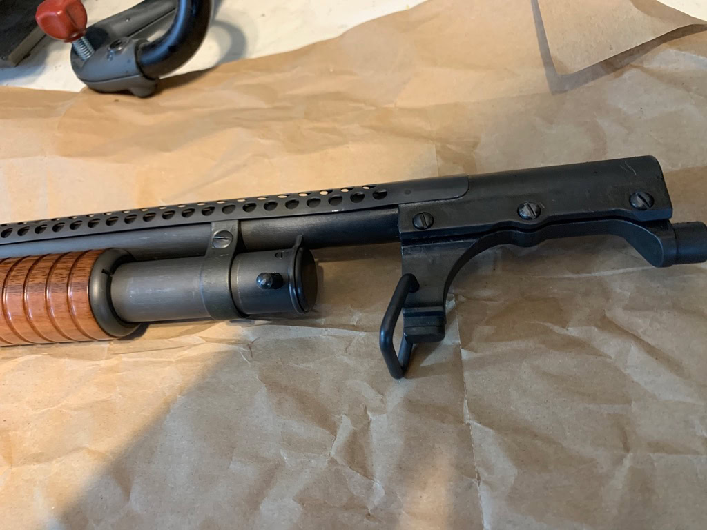This is a Winchester “97” Take-down “Trench Gun” shotgun built in 1942 for use in WWII.When it came to me it was missing the take-down mechanism and the heat-shield, and the barrel and the stock had been cut off. The owner purchased it in that condition and brought it to me to be completely restored, including parkerizing, to its original condition.Here is the final product!