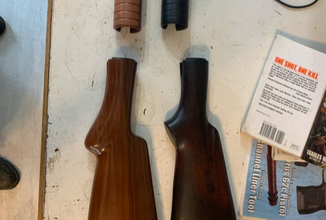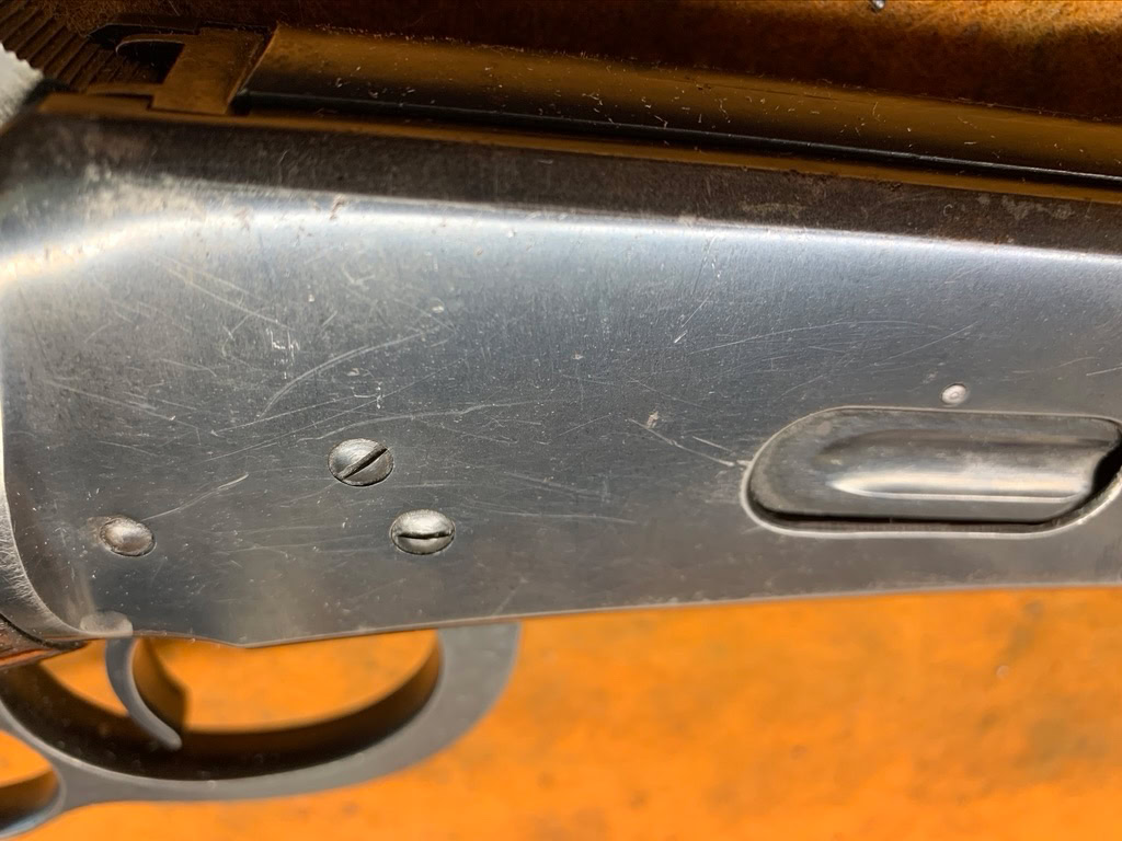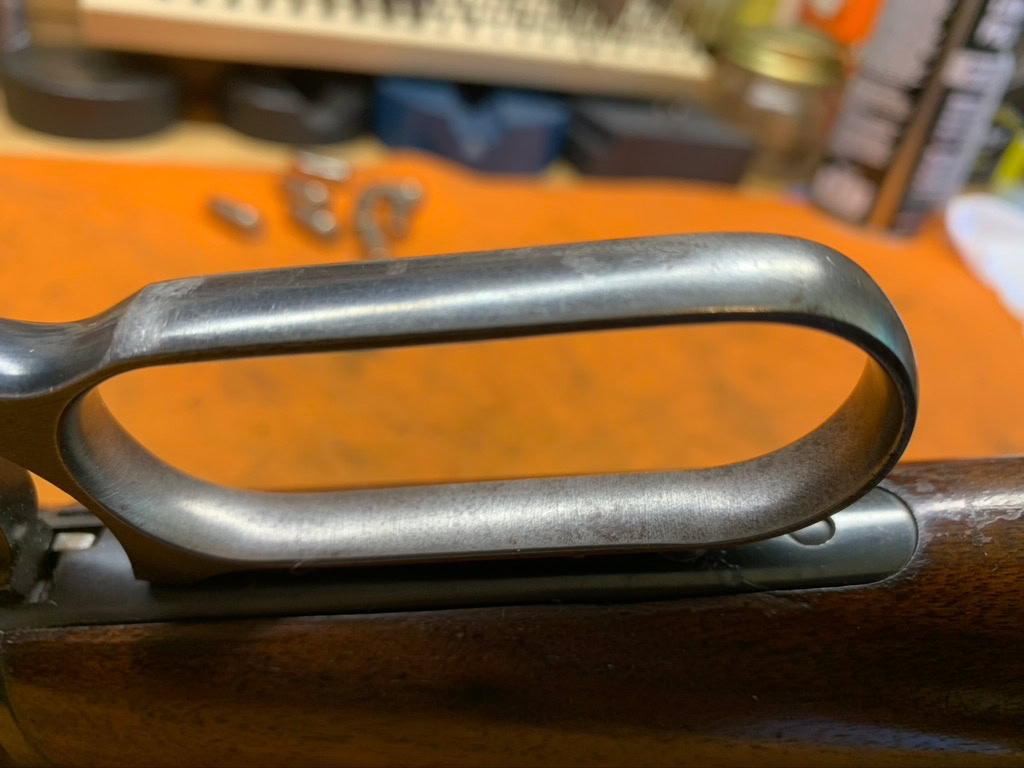 This is a Winchester 94 that was created in 1954.The owner is a firearm collector and enthusiast who decided he wanted this rifle restored to a “like new” condition.There was heavy deep pitting on both sides of the receiver as well as uneven surface rust throughout.Additionally, someone had beat the heck out of the front sight, malforming it. Further, the cartridge guide screws were rusted in-place and required drilling out and retapping from outside the receiver.As you can see, the stock was heavily worn and discolored.After literally hours of sanding and polishing the parts to remove rust and pits, I blued the parts that are normally blued and polished the parts that are not.It turned out the butt stock was cracked in two places and someone had added a sling swivel to the butt stock the owner wanted removed.I plugged the sling swivel hole and repaired the cracks, stripped the stock and forearm, then refinished them with a light-red traditional walnut stain.The rifle came out beautifully and increased its value by at least as much as the owner paid for the restoration.Looks like it just came off the factory floor in 1954.