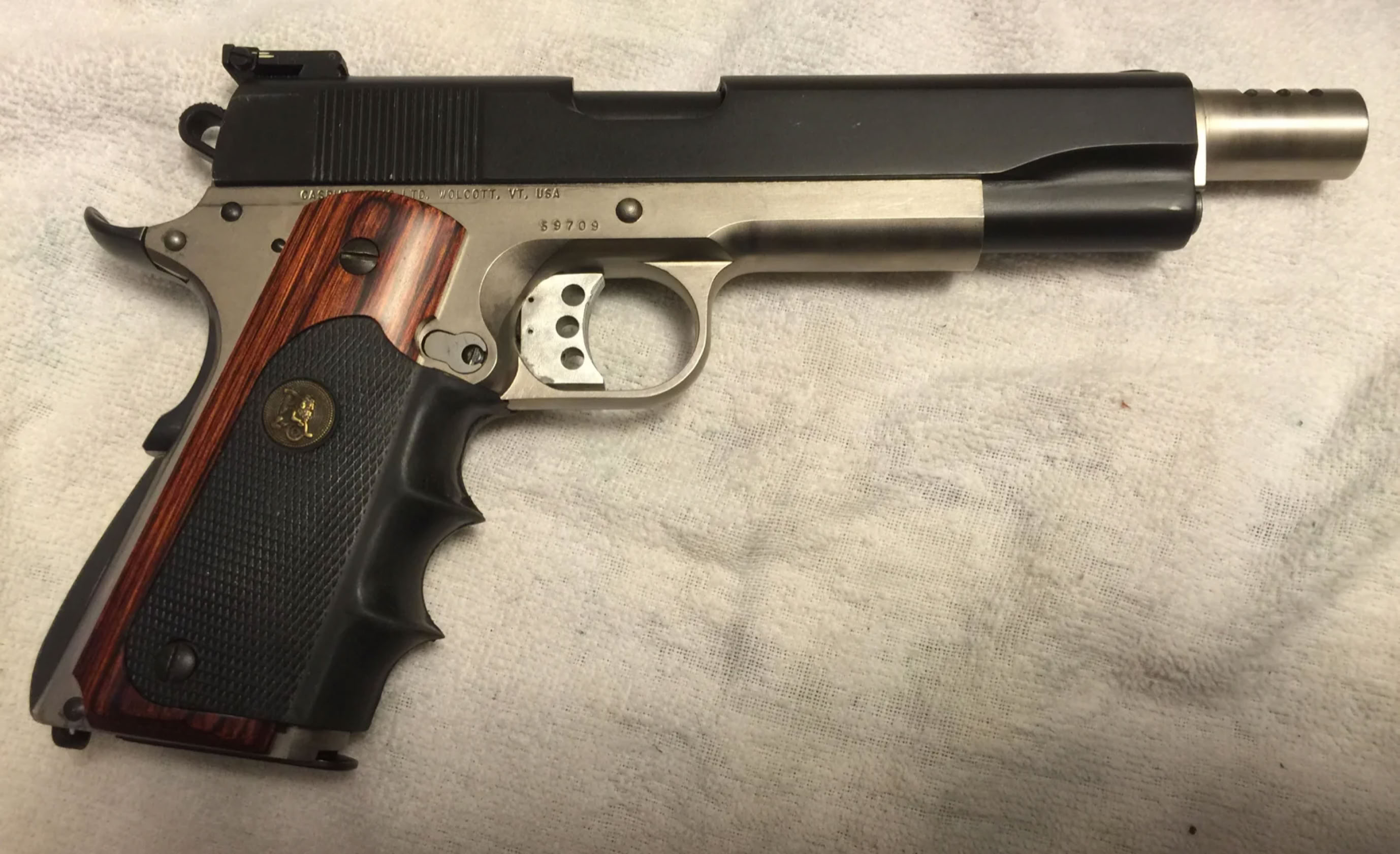 1911 I built for myself. I nickel plated the frame, installed oversized mag release, slide release, and safety, and reduced the over travel to zero. Took out all trigger creep, and set the trigger pull to around 3 lbs. Smooth, slick, pretty, and powerful.One of my favorites.