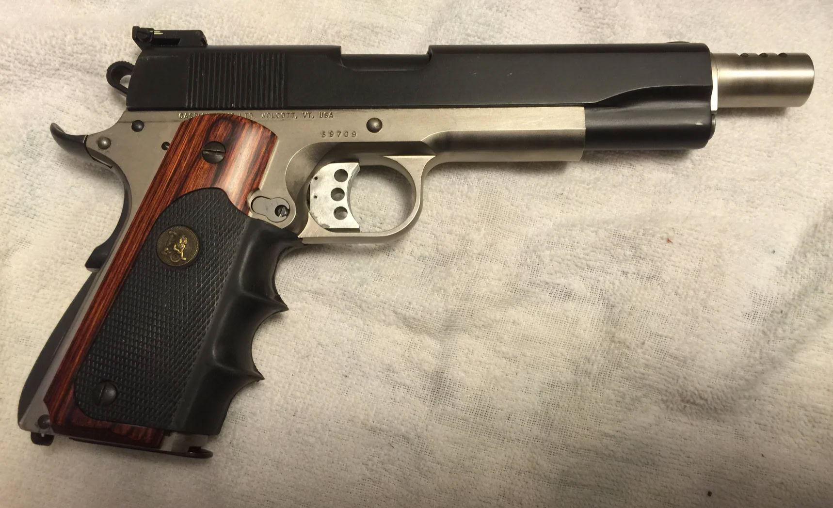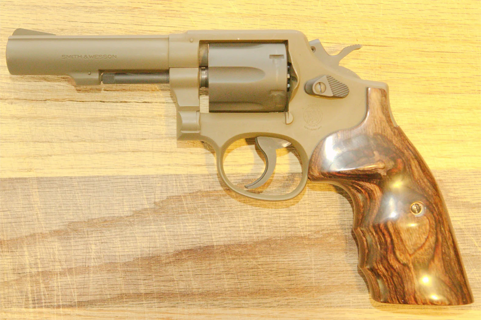 Old S&W Model 10 Police Revolver a good customer broughtin.It’s as presented condition was a bit rough. The cylinder and frame exhibited deep pitting and rust in several locations that were too deep to polish out for re-bluing.My customer had me two-tone cerakote it in Patriot Brown and Armorer’s Black.(The black is hard to see in the lighting for pictures).You’d never know the surface wasn’t pristine after cerakoting!Looks great with a hard-as-nails coating that will last and last!My customer also replaced the grip panels with these beautiful and very functional grips.Have an old firearm that wouldn’t be suitable for re-bluing, but you want to look like a million bucks?Bring er’ in and let’s work up a finish!