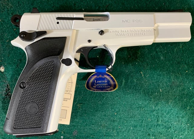 Factory Cerakoted “Arctic White,” this Girsan PA35 is a Browning Hi Power near-clone. The Hi-Power has historically been one of the most popular and commonly found 9mm handguns in European police and militaries. Girsan took the Hi Power and did all the custom work Hi Power owners typically effected to their Hi Power to make it more usable, serviceable, and better shooting! Comes in a fitted plastic case with spare magazine.