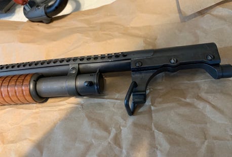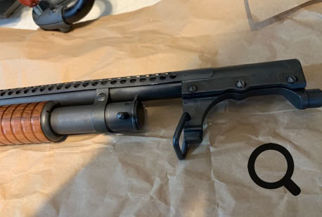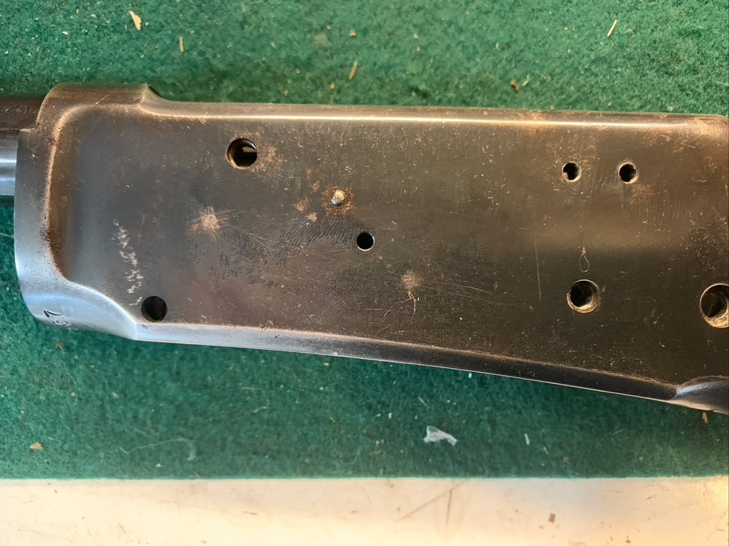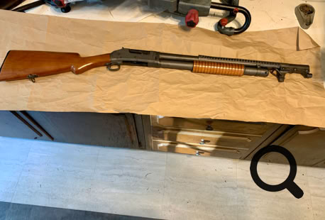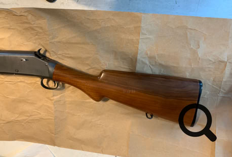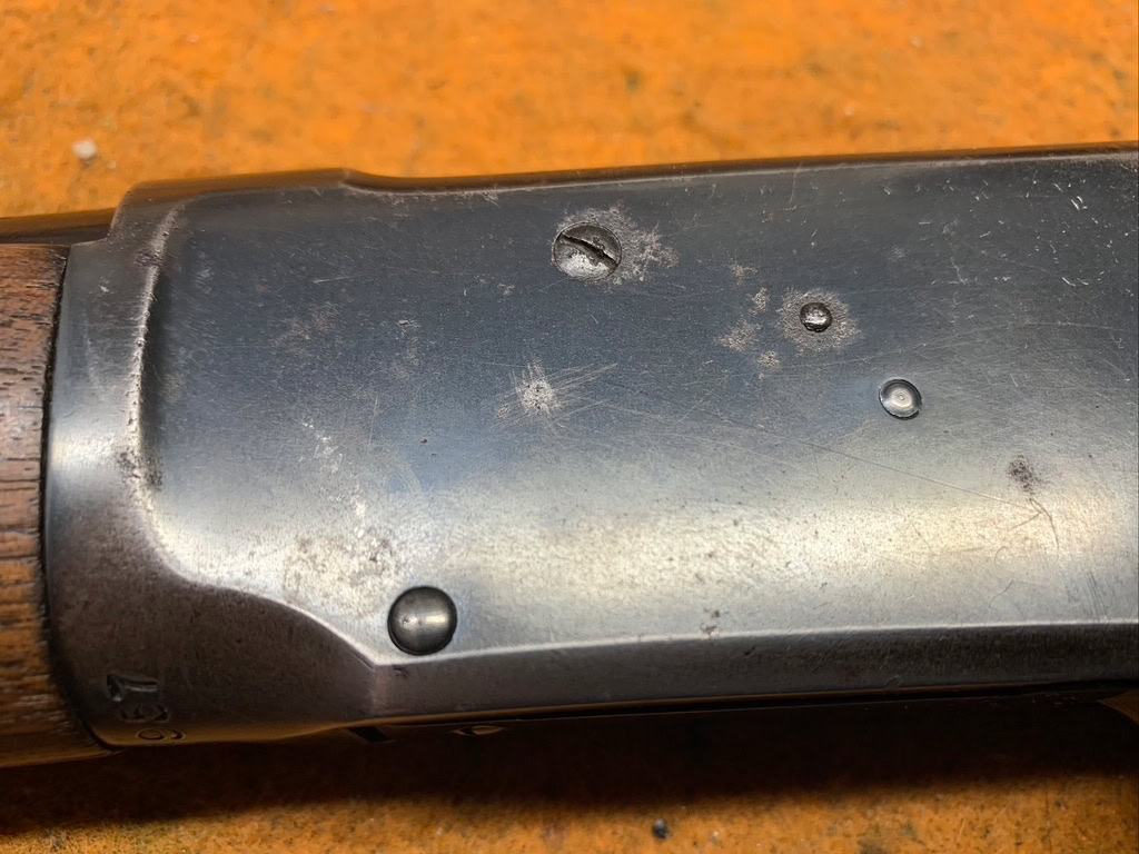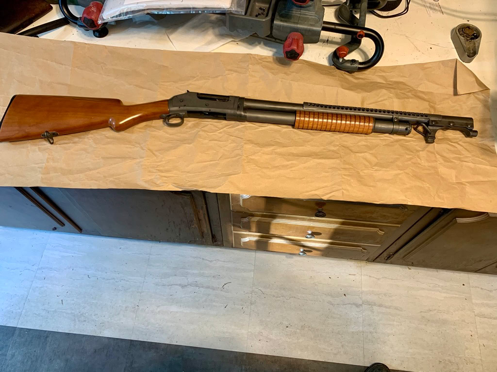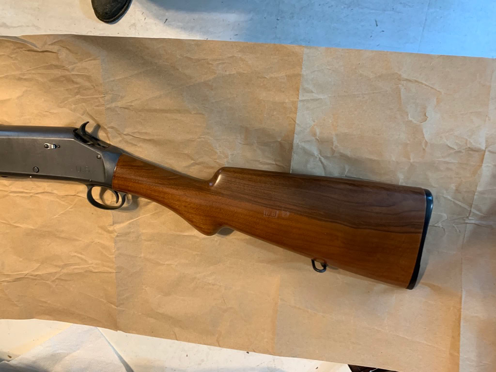 This is a Winchester “97” Take-down “Trench Gun” shotgun built in 1942 for use in WWII.When it came to me it was missing the take-down mechanism and the heat-shield, and the barrel and the stock had been cut off. The owner purchased it in that condition and brought it to me to be completely restored, including parkerizing, to its original condition.Here is the final product!