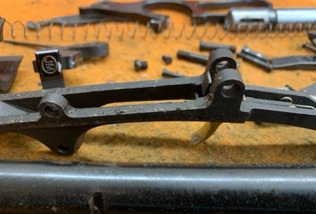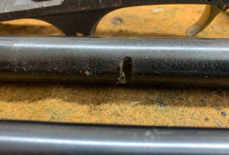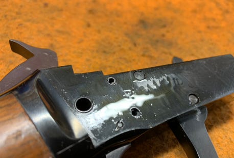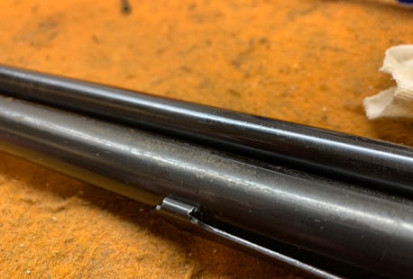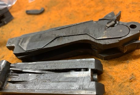 This is an OLLLLD percussion blackpowder 10 gage shotgun a customer brought in.The complaint was that it fails to extract.Upon inspection and disassembly I discovered someone had tried to repair the face of the extractor at some point. The guide pin was either missing or lost and they used a nail to “replace it.”Additionally, the extractor shaft was threaded on the business end, and while the threads held, they didn’t align the face of the extractor with the cylinders and the nail (you can see it above), was bent.Coupled with all this, the extractor operator you see above was broken in half, so even with the other parts correct, it would never actually extract.And, the top of the extractor where someone tried to repair it with a nail, had been cracked.