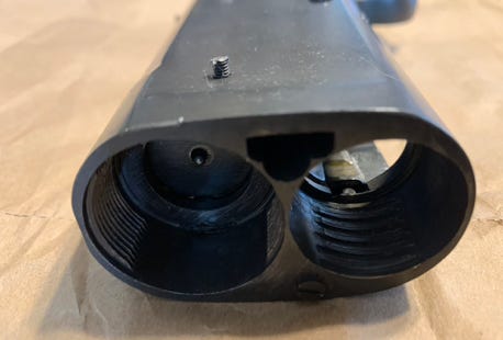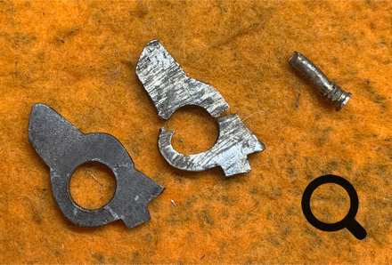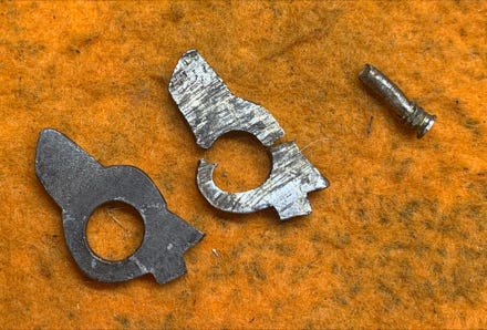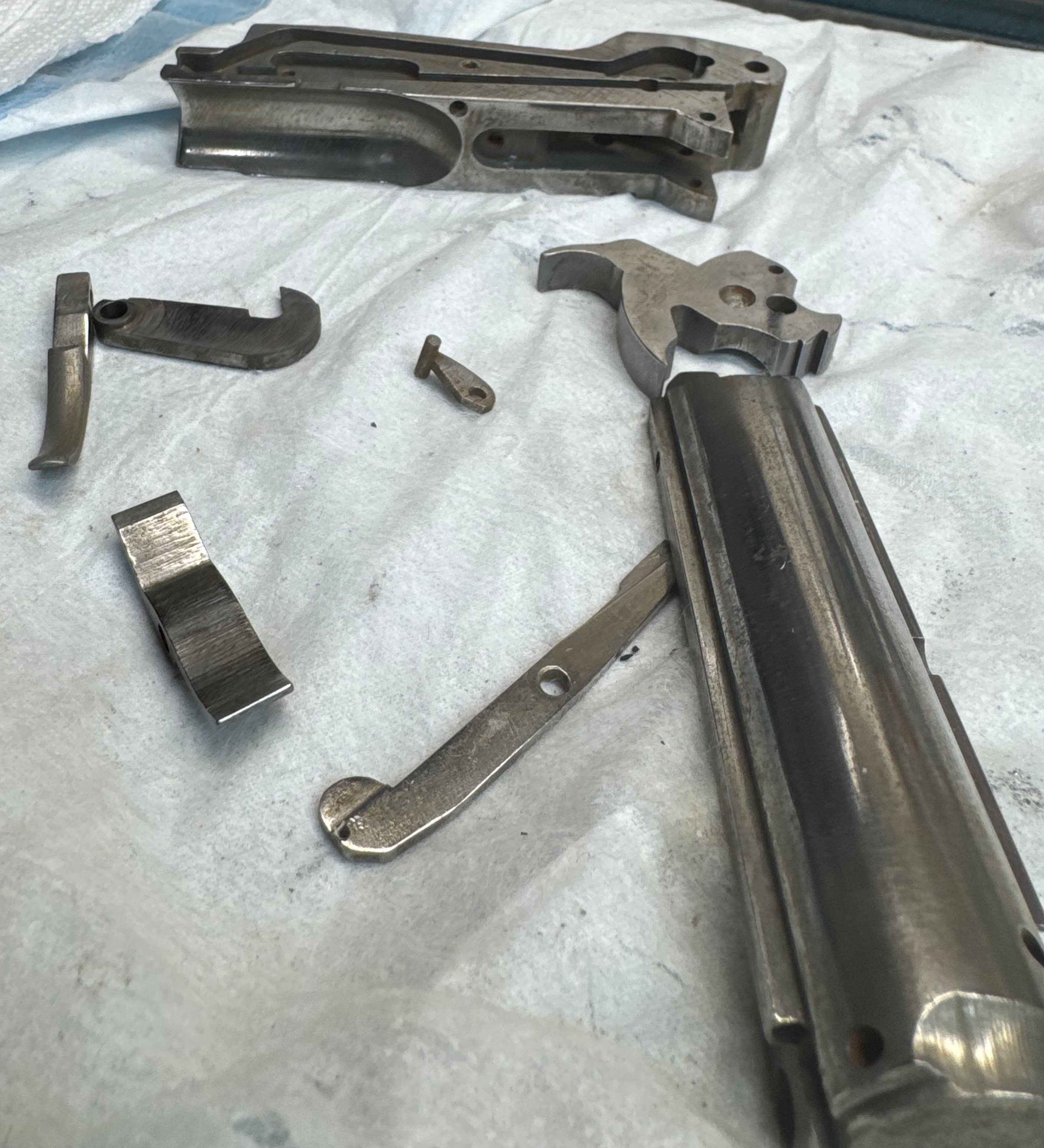 I made a replacement pin from spring stock, cut a vertical groove through the threads of the extractor shaft, and soldered them both in place with hi-strength solder.Then I made a replacement extractor operator (pictured on the left)from mild steel which I case hardened for strength, wear, and durability.As if this wasn’t enough, the retaining screw for the extractor broke into three pieces when I removed it so I redialed and tapped it and replaced it with a custom sized set screw.Simple problem - you’d think.Spent over two hours on restoring the great old shotgun to service.