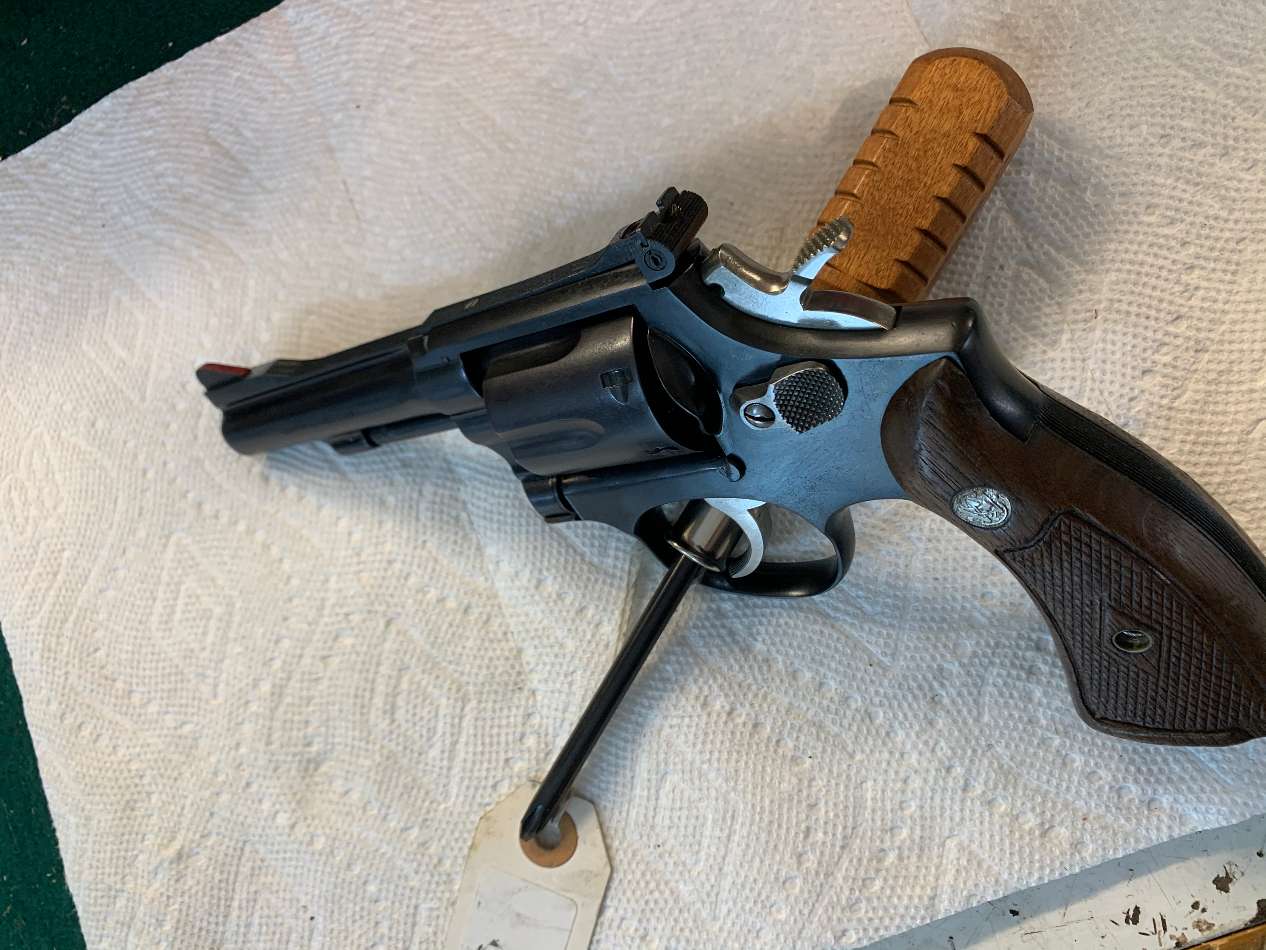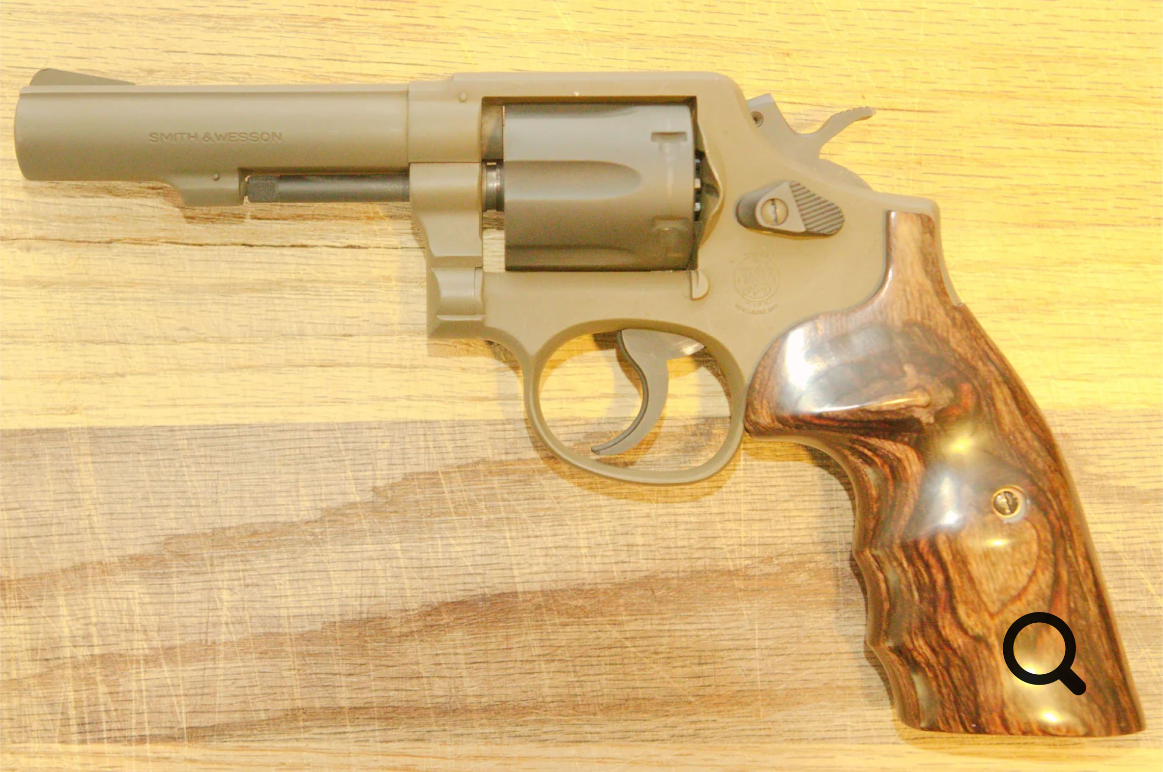 Old S&W Model 10 Police Revolver a good customer broughtin.It’s as presented condition was a bit rough. The cylinder and frame exhibited deep pitting and rust in several locations that were too deep to polish out for re-bluing.My customer had me two-tone cerakote it in Patriot Brown and Armorer’s Black.(The black is hard to see in the lighting for pictures).You’d never know the surface wasn’t pristine after cerakoting!Looks great with a hard-as-nails coating that will last and last!My customer also replaced the grip panels with these beautiful and very functional grips.Have an old firearm that wouldn’t be suitable for re-bluing, but you want to look like a million bucks?Bring er’ in and let’s work up a finish!
