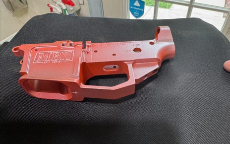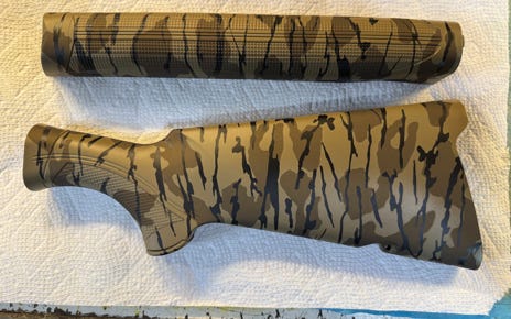 Stenciling with Cerakote is more complicated than with painting. Cerakote will not “stick” to Cerakote. Thus to apply different colors one must apply the first color, heat the parts to a lesser-than-curing temperature, cool the parts, apply the stencils, and repeat until all the colors have been applied, at which point the stencils are removed. At that point the parts are brought to curing temperature for 2 hours. Further, this all has to be done in one session. Thus Cerakoting a pattern usually takes an entire day’s work.