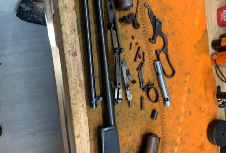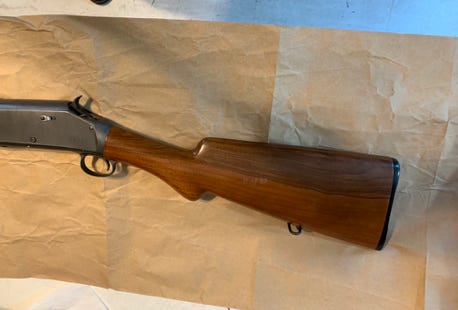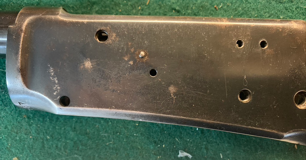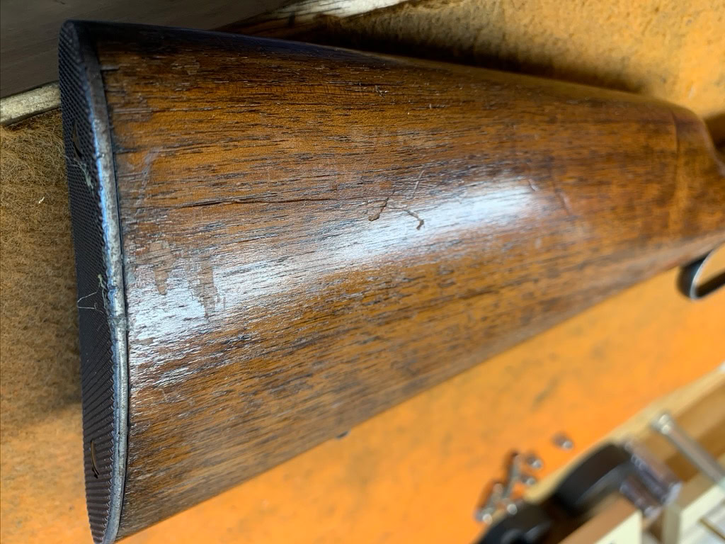 This is a Winchester 94 that was created in 1954.The owner is a firearm collector and enthusiast who decided he wanted this rifle restored to a “like new” condition.There was heavy deep pitting on both sides of the receiver as well as uneven surface rust throughout.Additionally, someone had beat the heck out of the front sight, malforming it. Further, the cartridge guide screws were rusted in-place and required drilling out and retapping from outside the receiver.As you can see, the stock was heavily worn and discolored.After literally hours of sanding and polishing the parts to remove rust and pits, I blued the parts that are normally blued and polished the parts that are not.It turned out the butt stock was cracked in two places and someone had added a sling swivel to the butt stock the owner wanted removed.I plugged the sling swivel hole and repaired the cracks, stripped the stock and forearm, then refinished them with a light-red traditional walnut stain.The rifle came out beautifully and increased its value by at least as much as the owner paid for the restoration.Looks like it just came off the factory floor in 1954.